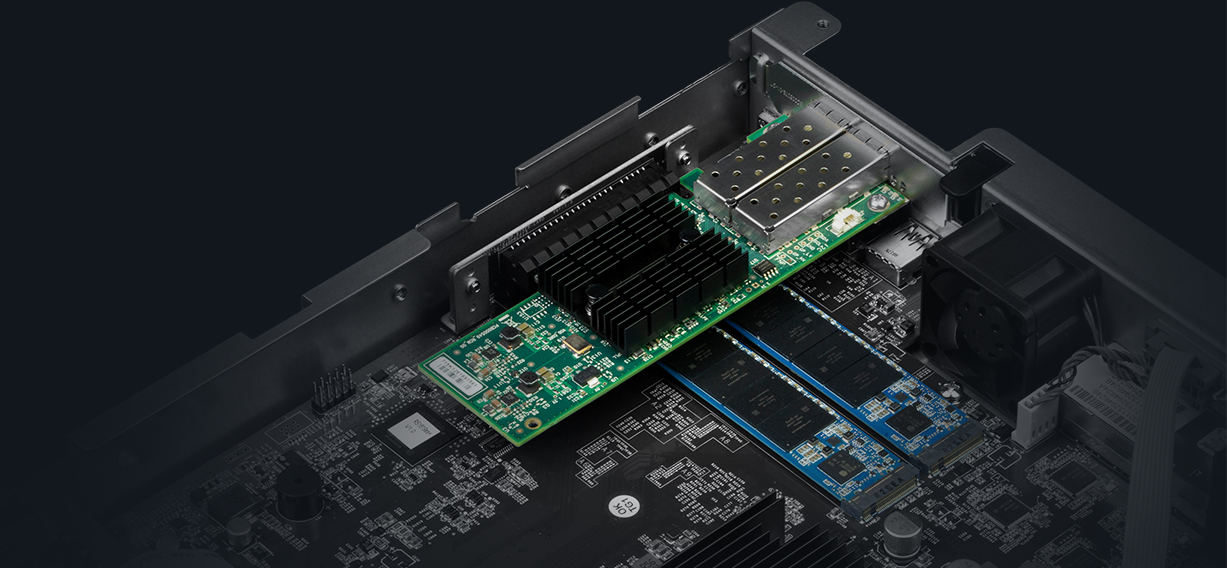 配備 PCIe 3.0 插槽,RS1619xs+ 支持安裝 10GbE/25GbE NIC 以實(shí)現(xiàn)快速數(shù)據(jù)傳輸。內(nèi)置 M.2 2280 SSD 緩存插槽能進(jìn)一步增強(qiáng) IO 密集型任務(wù),如虛擬化或郵件服務(wù)器部署。